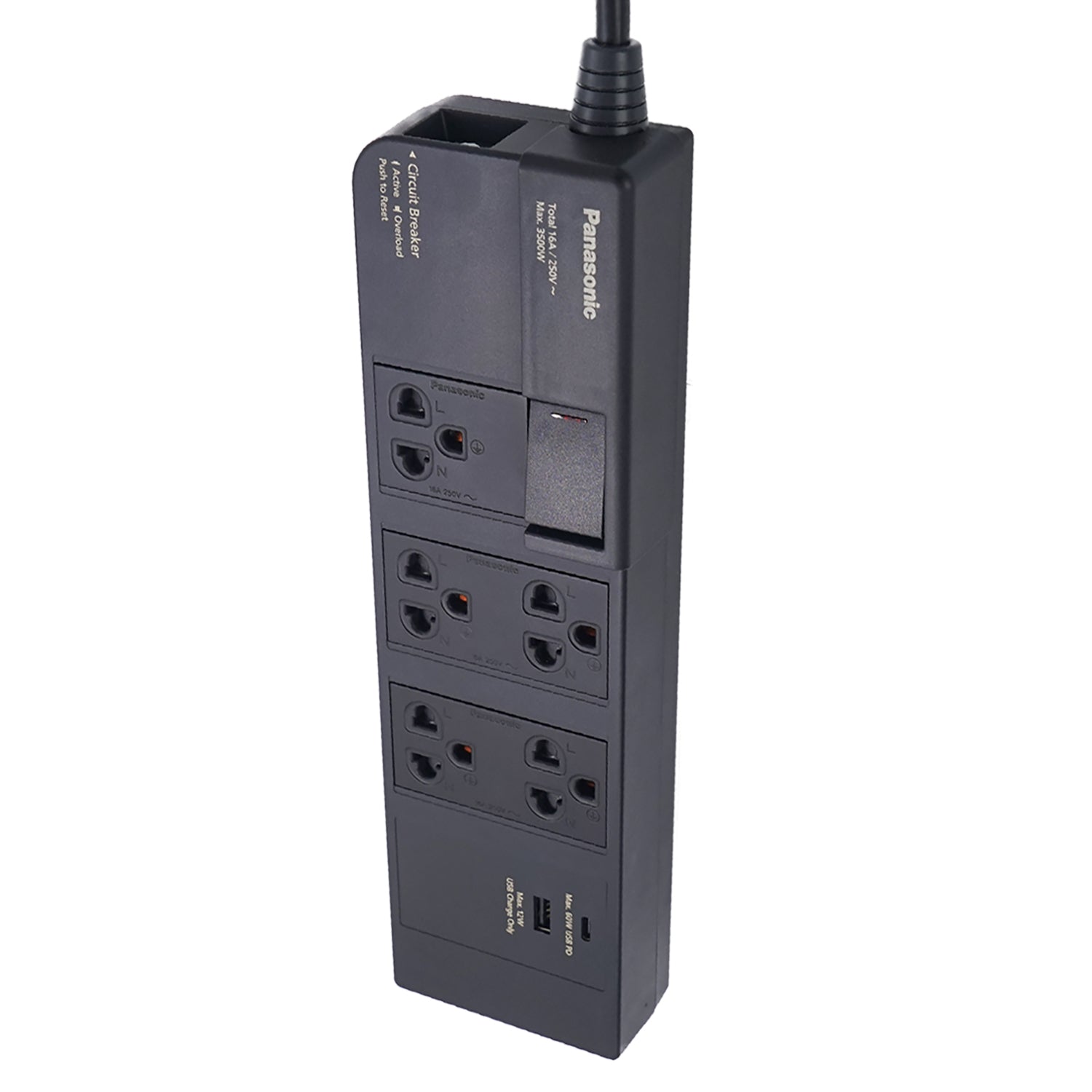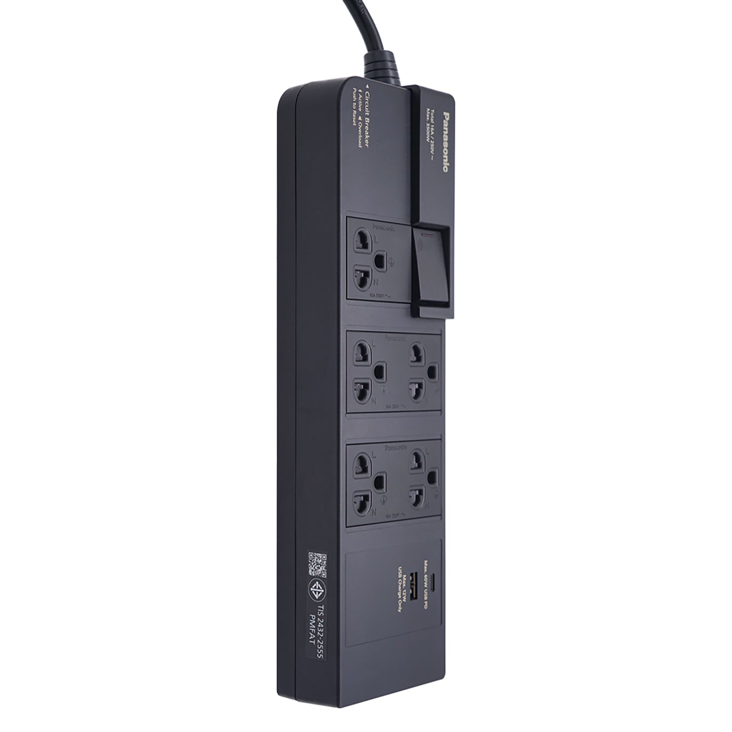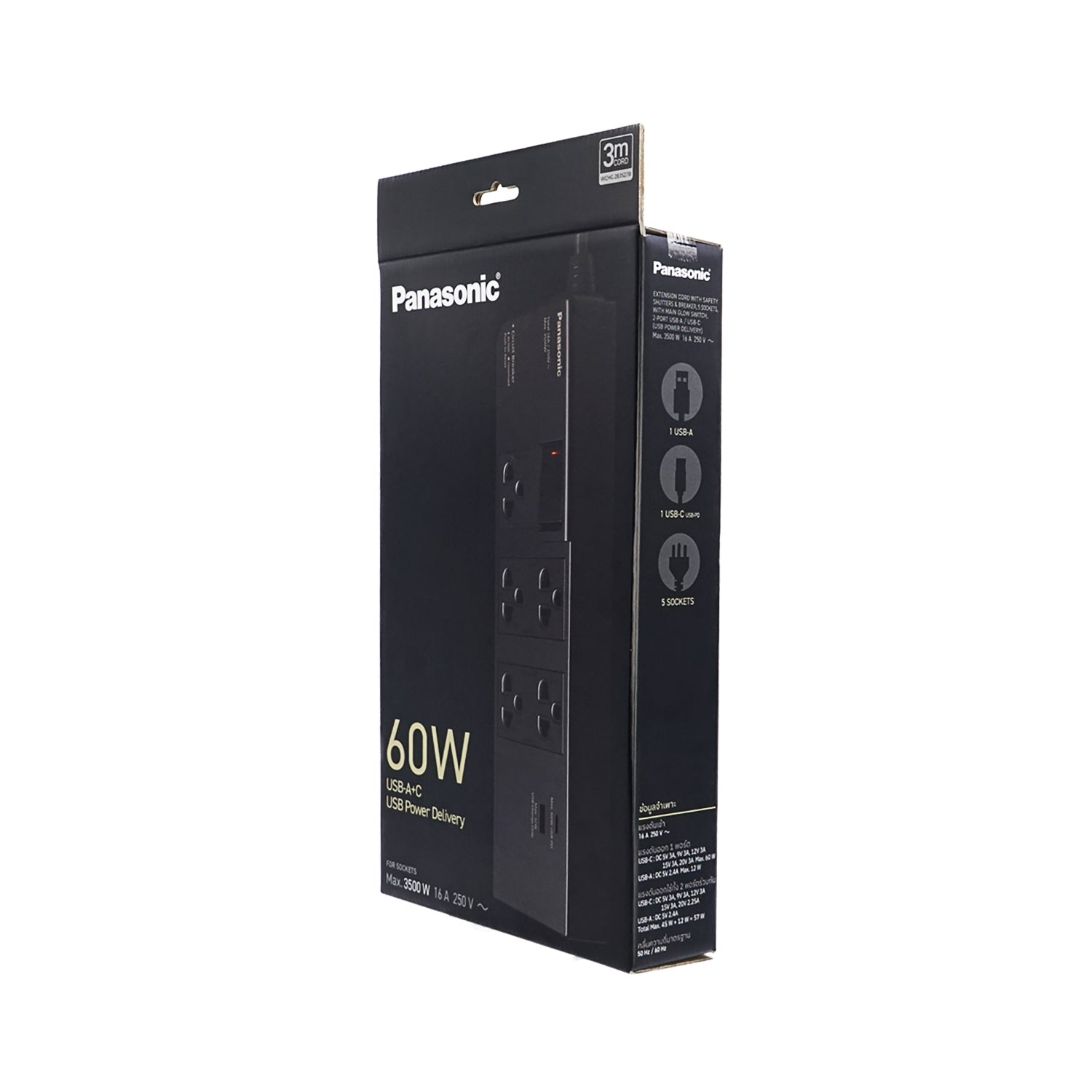 Panasonic WCHG283527B ปลั๊กพ่วงพานาโซนิค 16A 3500W 1 สวิตช์คุมรวม 5 เต้ารับ พร้อม USB-A+USB (PD) 60W