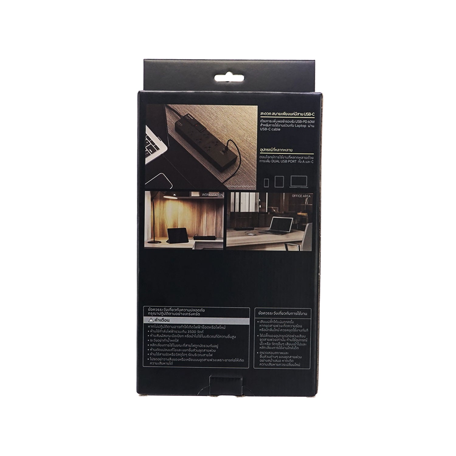 1 สวิตช์คุมรวม • 5 เต้ารับ พร้อม USB-A + USB Power Devery 60W (รองรับการชาร์จโน๊ตบุ๊ค)
